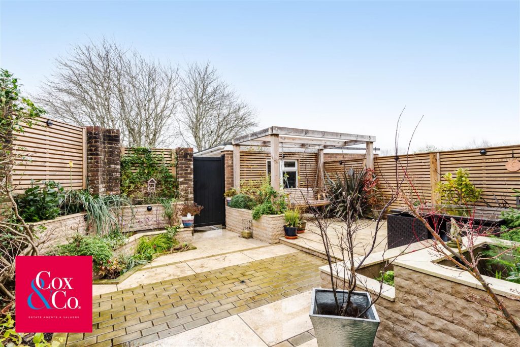 On entering, you are welcomed by a hallway that leads into an inviting open-plan living room and contemporary kitchen. This generous space is perfect for both relaxing and entertaining, with sleek finishes and sliding doors that open directly onto a large patio garden—ideal for outdoor dining and enjoying the sunshine. The garden also benefits from a rear access gate leading to off-road parking and a substantial garage, providing excellent storage or workshop/office potential.