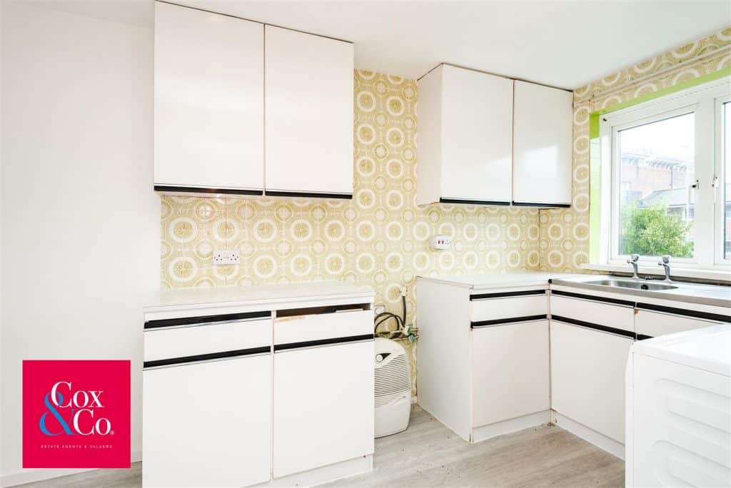 Towards the rear, the home opens into a bright and exceptionally spacious living room, complete with sliding doors leading directly onto the communal south-facing garden—perfect for enjoying natural light and outdoor relaxation. The adjoining kitchen offers plenty of worktop space and storage, and although in need of modernisation, presents a great opportunity for a buyer to tailor the space to their taste.