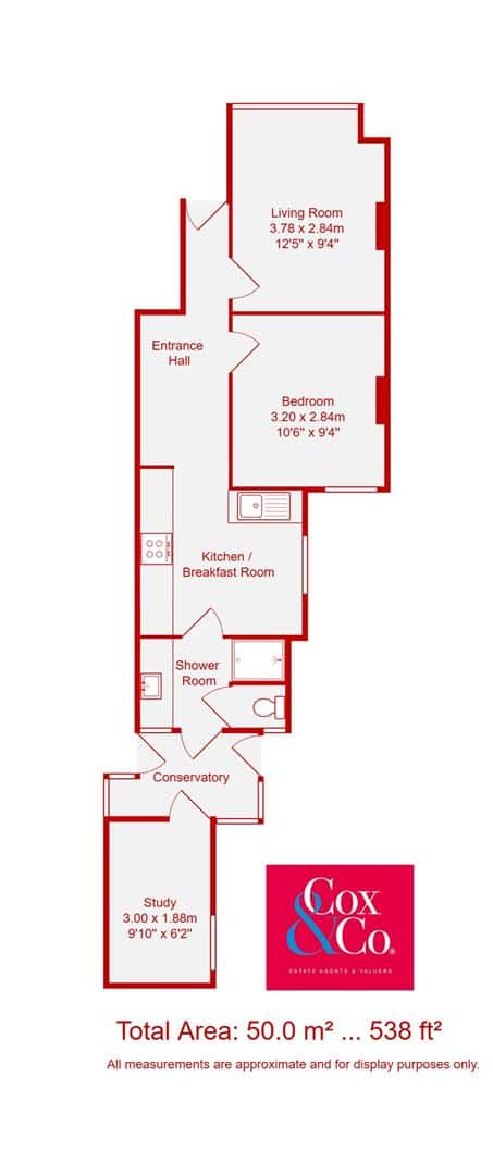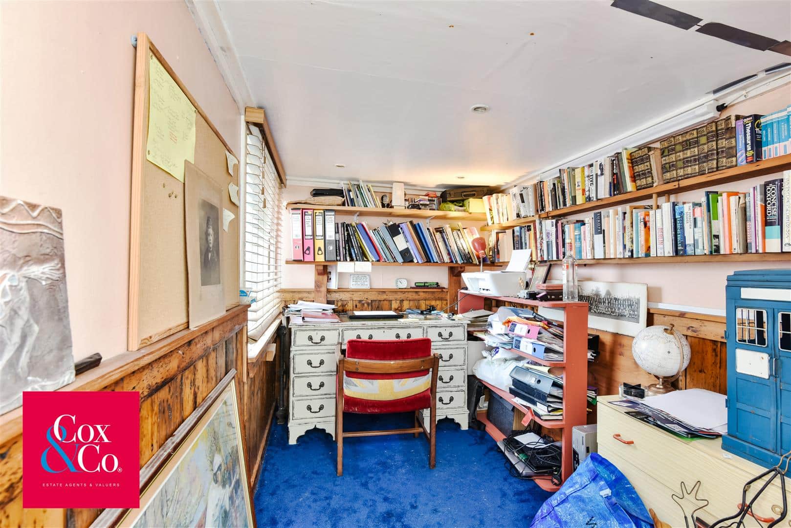 The kitchen is generously sized and located at the rear, offering ample storage and worktop space, along with room for a dining table—ideal for both everyday living and entertaining. Beyond the kitchen is a lean-to providing further storage and direct access to the garden. From here, you can also access an additional office or study, offering flexible use as a workspace, hobby room, or further storage.