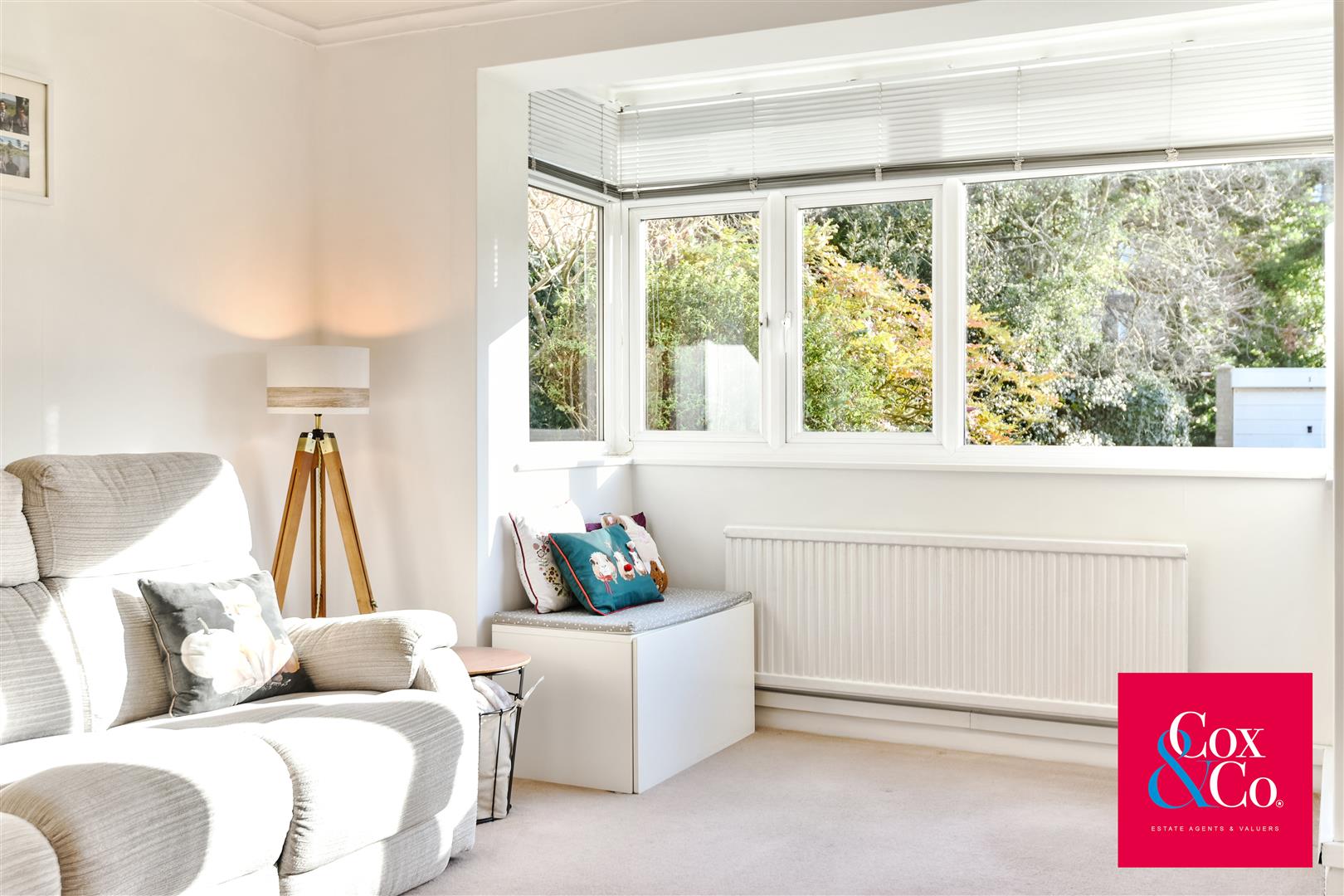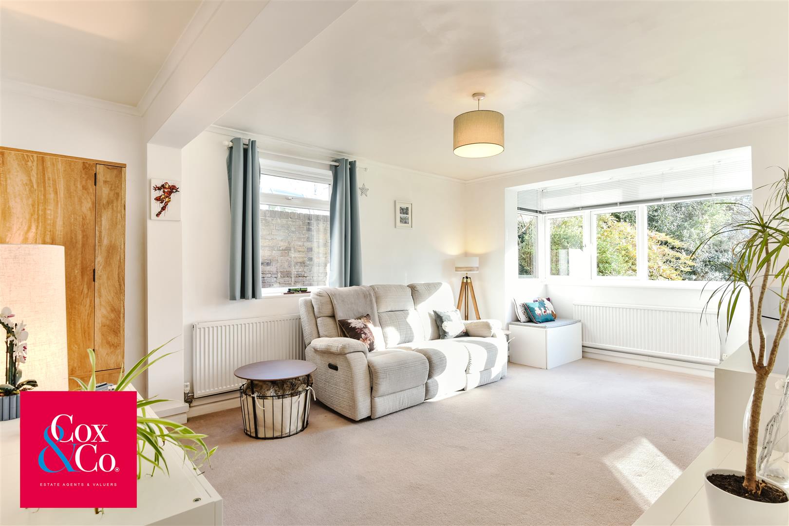 The living room is located at the rear of the apartment, providing generous proportions and attractive views over the communal gardens. This bright and comfortable space offers plenty of room for both lounge and dining furniture, making it perfect for everyday living and entertaining.