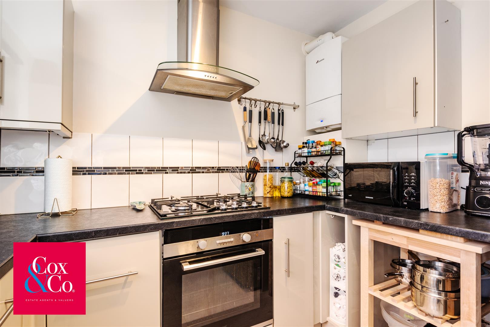Positioned towards the front, the modern kitchen is well designed with ample worktop space and a range of storage units, offering both style and practicality.